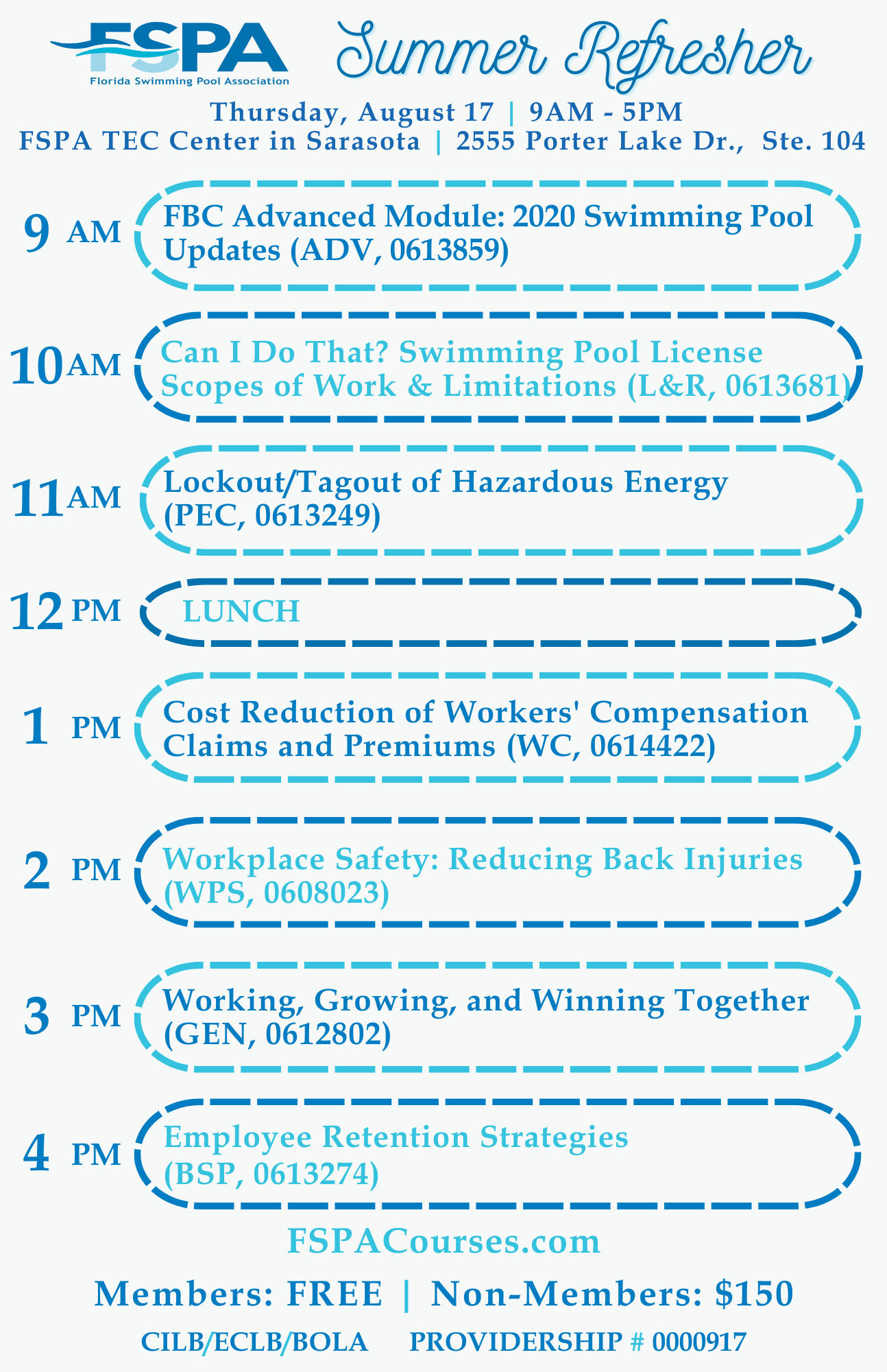 9:00 -9:50 AM FBC Advanced Module: 2020 Swimming Pool Updates (Instructor: Dallas Thiesen, FSPA, #0613859, meets ADV)
